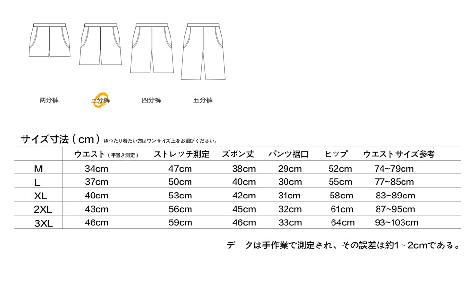 Length of the shorts: M=38cm L=40cm XL=42cm 2XL=44cm 3XL=46cm